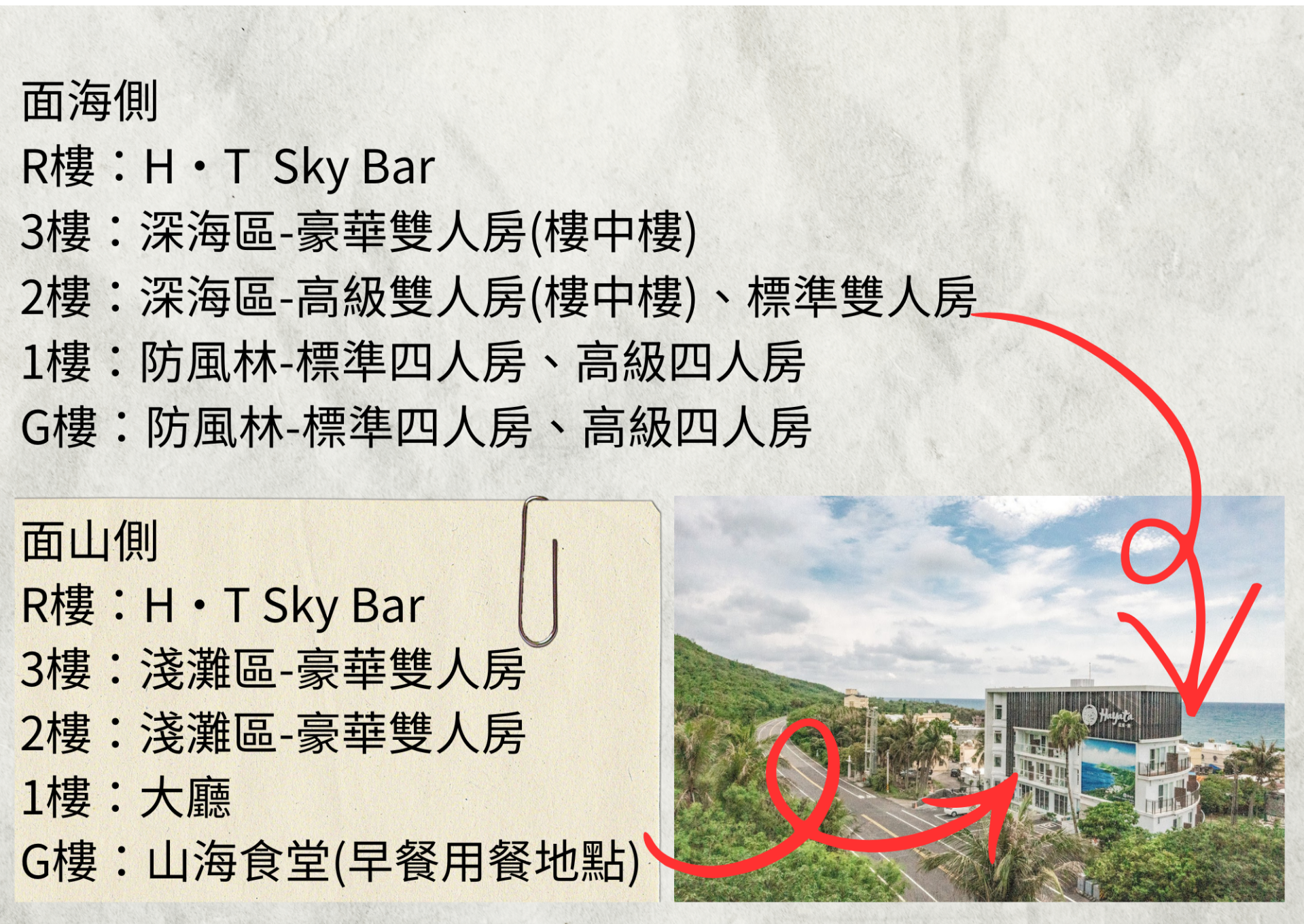 山海靜謐的房型位於二樓面海側的邊間(照片右側),是唯一看得到海的非樓中樓房型,但是他的海景因為角度的關係會有些遮蔽。