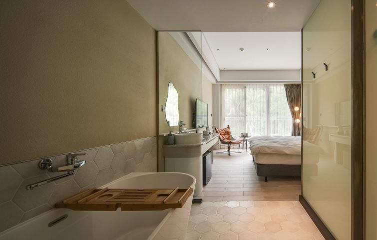 以沙灘常見的浪花蟹為意象,房內空間大多以奶茶色調為主,溫馨、舒適、體貼的擺設、格局及光影,為嚮往浪漫的旅人精心設計。